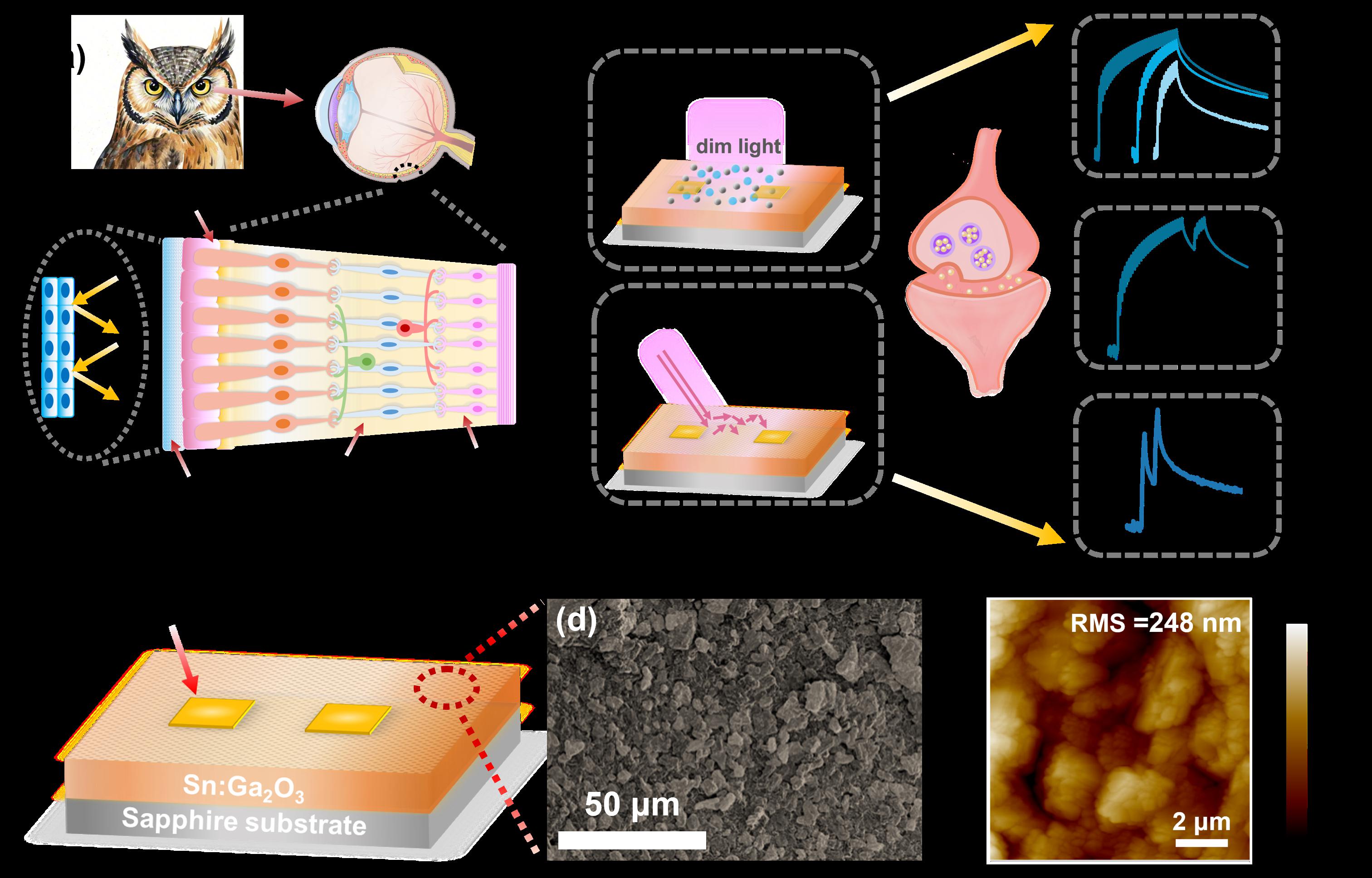 针对传统人工视觉系统在灵敏度与算力消耗上的矛盾,团队采用了晶界缺陷工程策略,制备了具有丰富晶界网络的粗糙Sn:Ga2O3多晶薄膜。该结构在物理层面模拟了猫头鹰的夜视功能,粗糙的晶粒表面通过漫反射延长光程,模拟了猫头鹰眼球后方照膜层的光陷阱效应,而高密度的晶界势垒则通过载流子俘获机制,模拟了视杆细胞对微弱信号的级联放大功能。