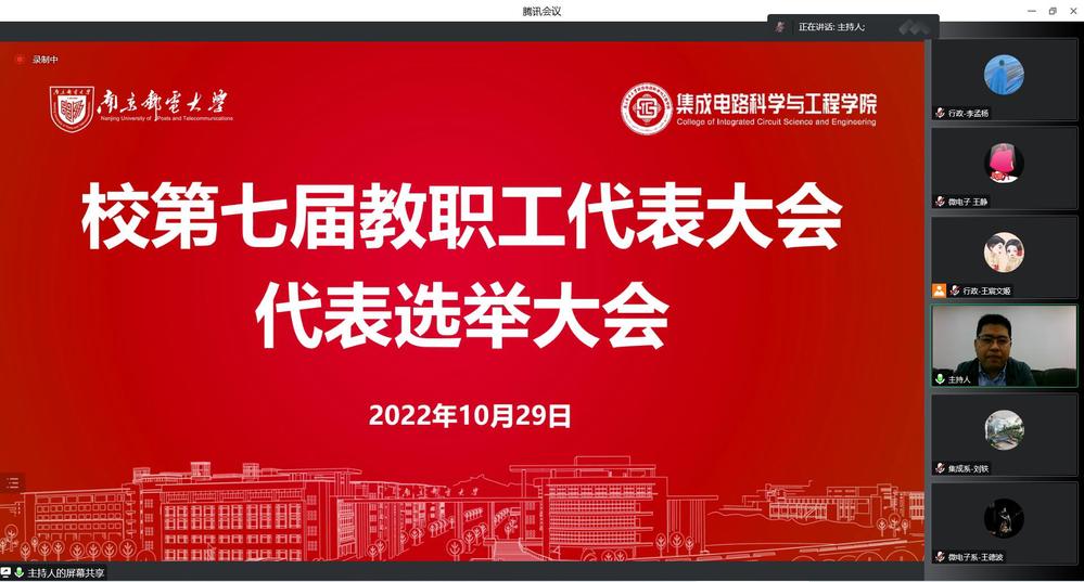 10月29日,集成电路科学与工程学院通过线上形式成功召开分工会成立大会暨一届一次会员大会,校第七届教职工代表大会代表和校第十三届工会会员代表大会代表选举大会。校工会副主席张效霓出席,学院全体教师参加本次会议,大会由院党委书记高翔和院党委副书记乔祖琴分别主持。