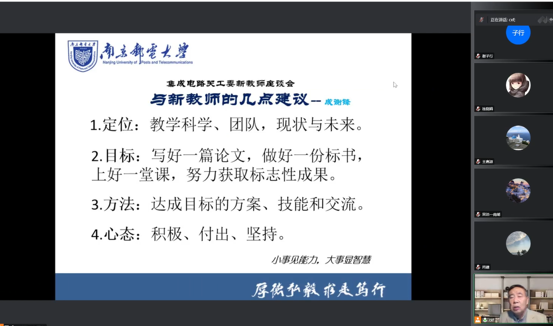 成教授从定位、目标、方法和心态四个方面对新教师们提出了几点建议。他指出新教师们应当明确自身在教学科学、所寻找到的合适团队以及当下与未来职业发展中的个人定位,从而明确适合自身的发展方向,并持之以恒地发展下去。
