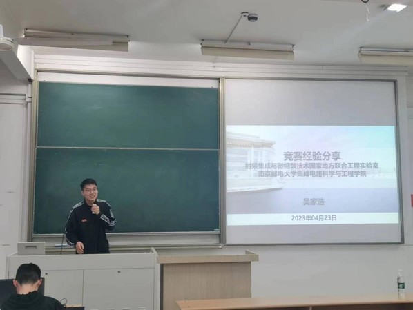 之后,吴家浩同学对在集成电路EDA设计精英挑战赛的经历进行了分享。吴家浩同学曾获集成电路EDA精英挑战赛总决赛一等奖。他围绕面向TCAD 仿真的通用器件模型算法和实现这一赛题展开,介绍了EDA赛事的技术要求、评分细节、技术输出要求等内容。他积极引导同学们抓住在校期间的机会,参加EDA不仅能够使用最新EDA工具进行集成电路核心IP开发、优化增强EDA工具以解决最新的集成电路设计问题,而且还可以培养团队精神。