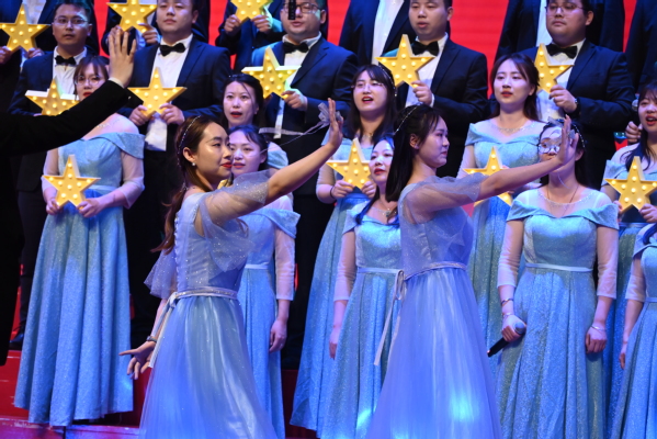 我院女教师身穿蓝色银河系列长裙,男教师黑色西装点缀领结。随着轻缓钢琴声的响起,乔书记深情地朗诵:“如果写一首诗,我更想写一首给你的诗,一首敢闯敢为的诗,一首高歌猛进的诗,一首朴素的诗,一首从容的诗,一首希望的诗,自由而坚定的诗,如愿以偿的诗。”合唱团成员们手拿点亮的星星灯,一齐放声高歌。动听而轻柔的歌声伴随着妙曼的舞姿,节奏铿锵有力,和声精妙、张弛有度、振奋人心,表达了我院青年教师愿接续薪火的坚定,展现出集电人的爱国热情和家国担当。歌曲结束后获得了现场观众们如潮般的热烈掌声!