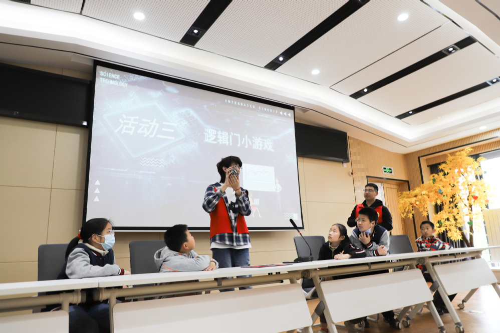 “打印机好酷,是怎么做出来的呢?”“我们也想制作一个!”小观众们听得认真、看得投入、问得积极,提问声、欢笑声此起彼伏。在志愿者们的带领下,孩子们还上手体验制作了基于芯片的小小留声机,互动感受了逻辑门小游戏,在实践中畅游芯片海洋、探知创新力量。