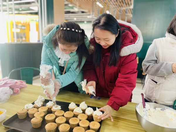 活动现场,烘焙小屋给大家准备好制作原料。大家细心地裱花,将奶油装进裱花袋,轻轻按动裱花袋的尾端,把稳花嘴对准蛋糕的中心,一按一挤,一个个精致可口的纸杯蛋糕便呈现在眼前。饼干制作的趣味在于创作,没有模具的束缚,大家摘起一段面团,在掌心揉搓呈球状,轻轻按压,充分发挥女性的美食天赋和想象力,便有了小熊、笑脸、兔子等可爱的卡通状饼干。当饼干烤出来后,老师们、同学们品尝着自己的劳动成果,体会着节日的喜悦。