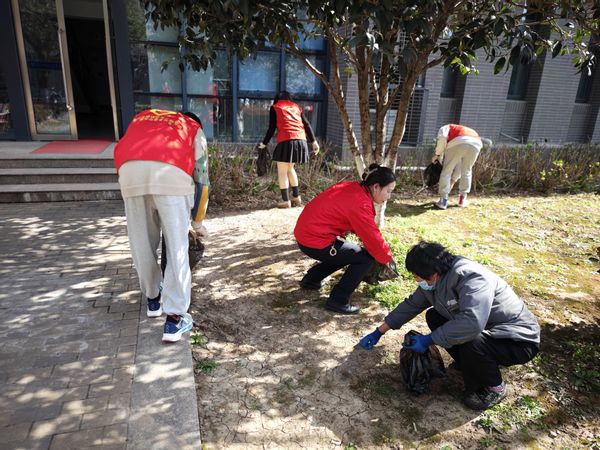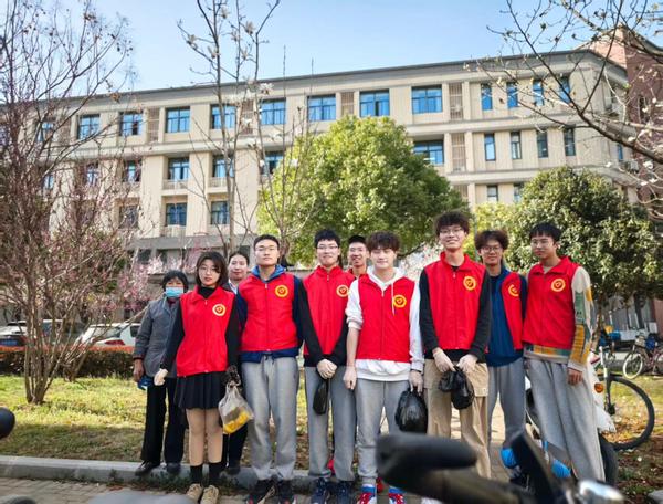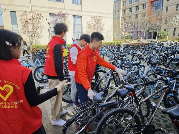 下午阳光洒在教学楼前,一群身着志愿者服装的同学们在楼管物业阿姨的带领下,手持清扫工具,早早地在电光科学课B楼前集合。同学们分工明确,有的负责清扫落叶和纸屑,有的负责捡拾垃圾,还有的负责摆放自行车。大家热情高涨,干劲十足,以实际行动践行雷锋精神。
