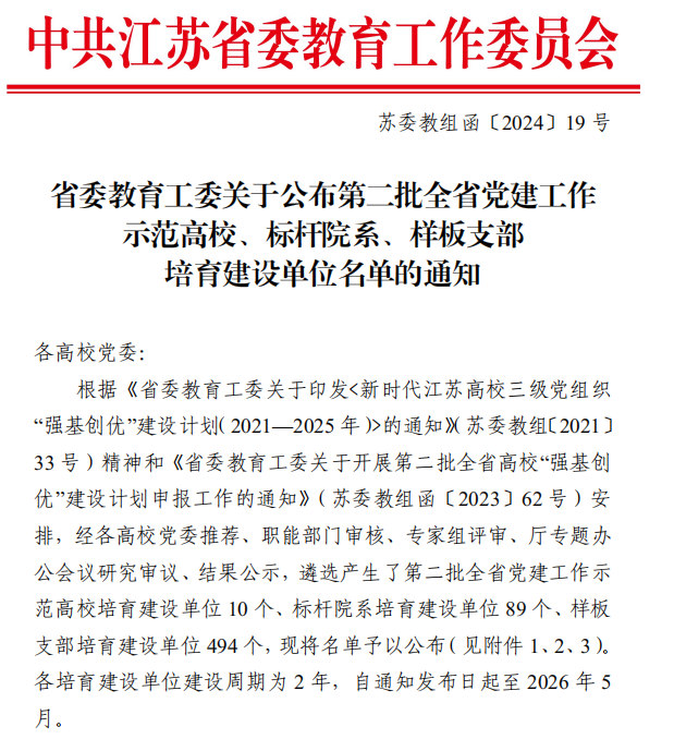 根据《省委教育工委关于公布第二批全省党建工作示范高校、标杆院系、样板支部培育建设单位名单的通知》苏委教组函〔2024〕19号,我院微电子系教工党支部成功入选第二批全省党建工作样板支部培育建设单位。