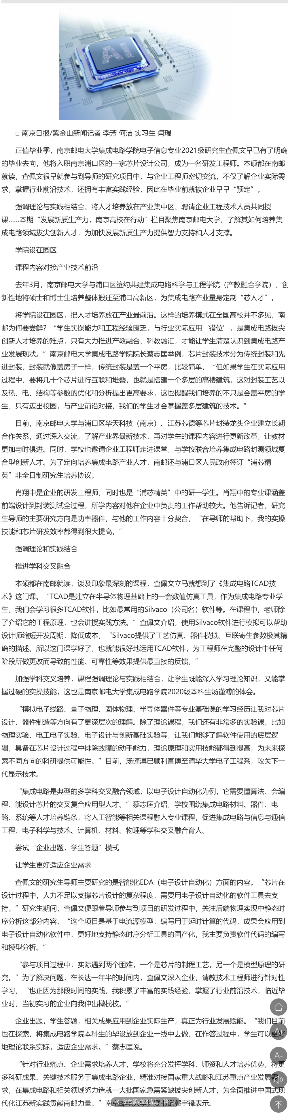 【南京日报】南邮探索集成电路拔尖创新人才培养新实践
