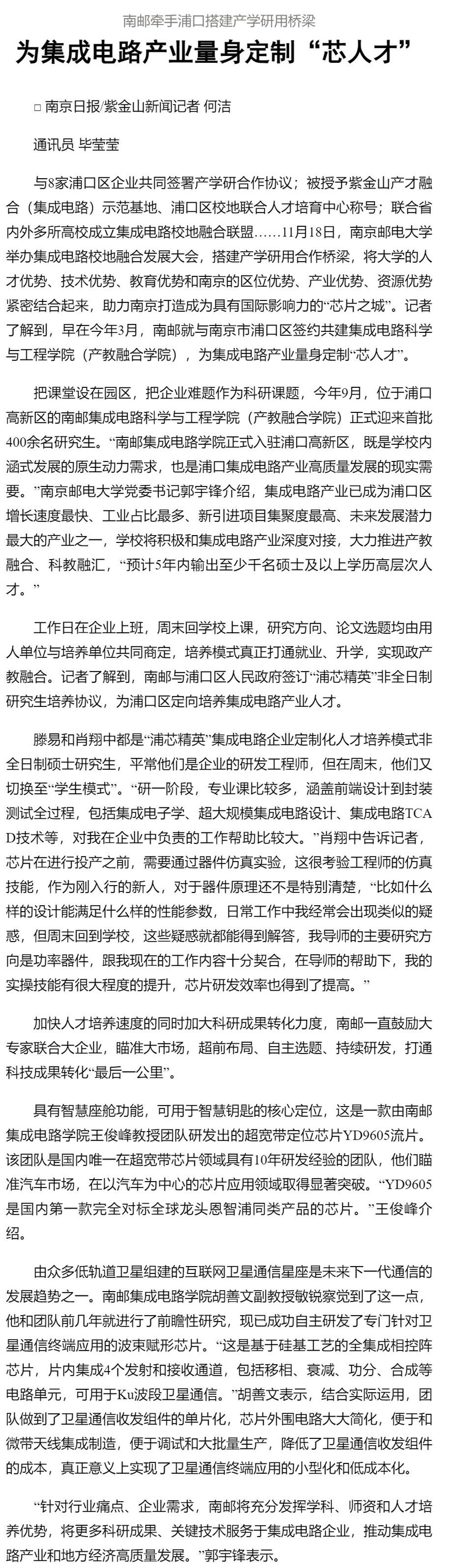 【南京日报】南邮牵手浦口搭建产学研用桥梁 为集成电路产业量身定制“芯人才”