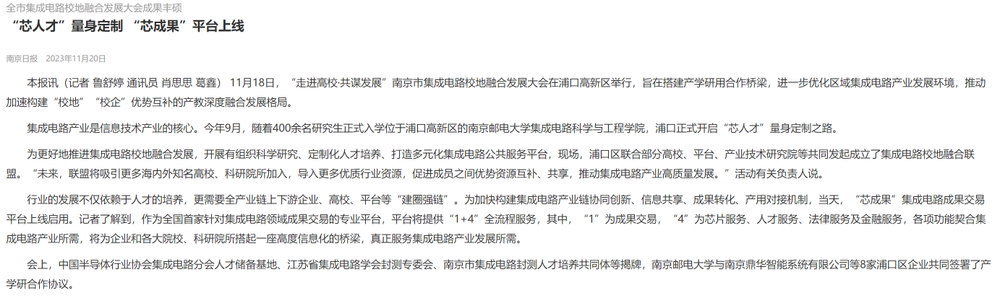 【南京日报】“芯人才”量身定制 “芯成果”平台上线