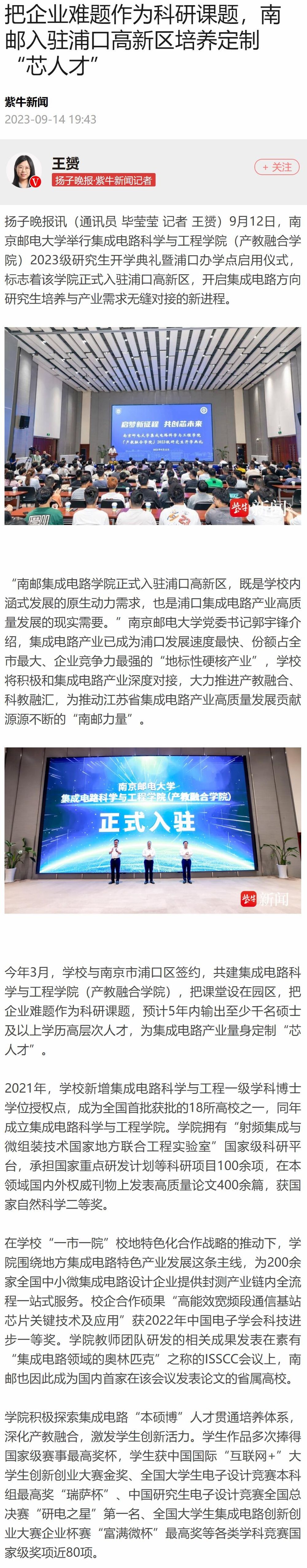 【扬子晚报客户端】把企业难题作为科研课题,南邮入驻浦口高新区培养定制“芯人才”