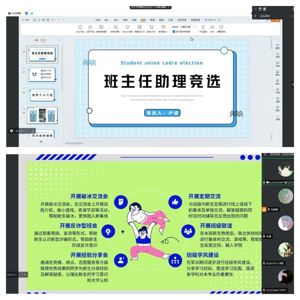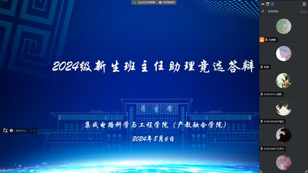为迎接即将到来的新生开学季,进一步加强新生班级建设,解决新生在生活、学习等方面存在的各类问题,帮助他们更好适应大学生活,8月6日晚,我院于线上举行2024级新生班主任助理竞选答辩。学院2022级辅导员王辉和2024级新生辅导员范建鹏出席本次答辩并担任评委。本次答辩由范建鹏主持,共有12名同学参与。