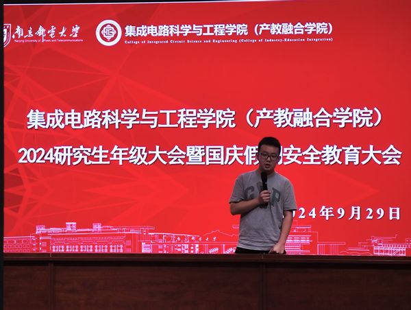 为加强研究生新生的安全意识,明确青年学生的时代责任,集成电路与工程学院(产教融合学院)于9月29日在浦口办学点报告厅举办了“放假不放松,安全记心中”主题的十一假期安全教育大会暨2024级研究生年级大会。辅导员王永鹏老师、优秀研究生代表王怡钦学长及全体新生参加了本次大会。