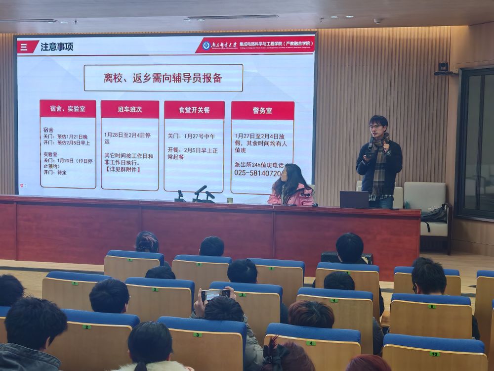 1月14日下午14:00,研究生辅导员张龙组织全体寒假申请留校研究生在浦口1号楼报告厅召开研究生假期管理与安全教育大会。院党委副书记、副院长肖俊桂出席,学院全体留校研究生参会。会上,张龙老师就寒假留校期间学生管理规范进行了解读,并为学生介绍了浦口行政、食堂、生活区等开放、关闭时间,以便同学们能够合理安排假期校内生活。肖书记在会上叮嘱同学们务必遵守假期留校的相关规定,出现任何问题应第一时间联系导师和辅导员,并结合实际案例,针对宿舍用电安全、食品安全、网络安全以及个人财物安全等提出了具体要求。