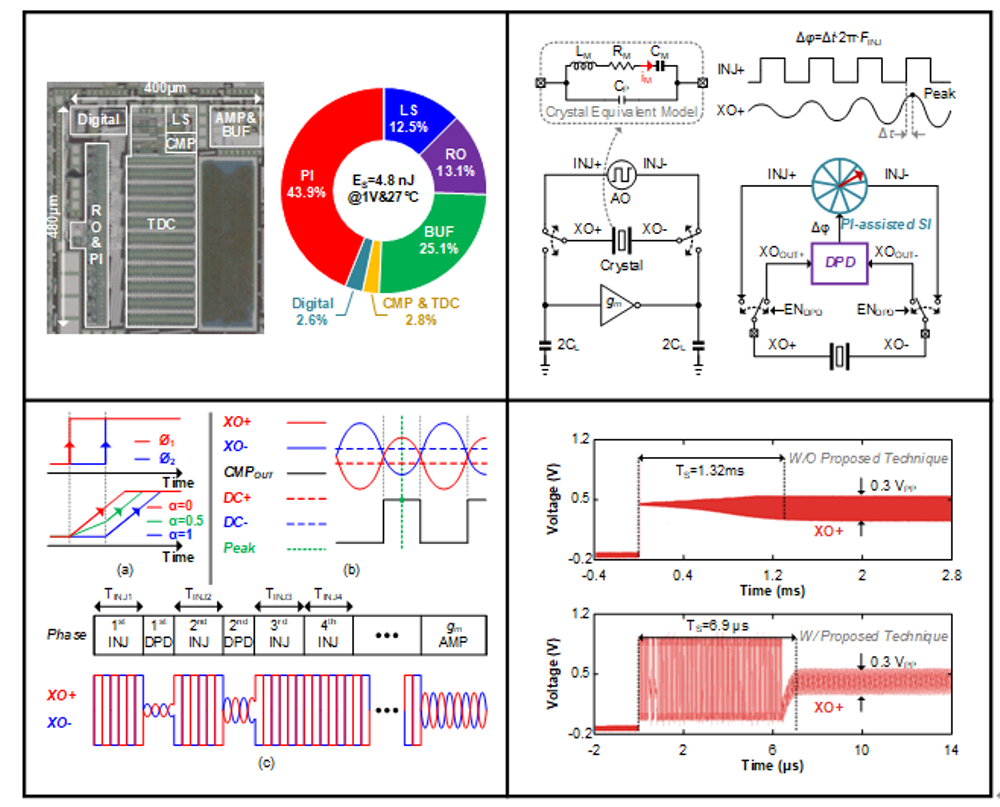 2025年6月8日至12日,bw西汉姆联郭宇锋教授团队在第45届VLSI工艺与电路研讨会(45th Symposium on VLSI Technology and Circuits,简称VLSI 2025)发表创新研究成果,实现了bw西汉姆联在该顶级国际会议上的首次突破。该成果题为《A 24-MHz Crystal Oscillator with 6.9-μs Startup Time and 2% Injection-ΔF Tolerance Using Phase-Interpolator-Assisted Synchronized Injection》,由集成电路科学与工程学院博士研究生王鑫担任第一作者,王子轩教授、蔡志匡教授、麦沛然教授共同担任通讯作者。研究聚焦于物联网设备中时钟系统启动缓慢的行业痛点,创新性提出基于相位插值器的同步注入技术。通过高效相位同步的注入机制,该技术显著缩短了时钟源的启动时间,为解决时钟系统启动延迟问题提供了全新思路。研究团队采用40纳米工艺完成芯片流片验证,测试数据显示:时钟源启动时间从传统技术的1.32毫秒大幅缩减至6.9微秒,优化效果达191.3倍;同时实现±2%的超大注入频率偏差容限,充分验证了该技术的高性能与高可靠性。这一成果为物联网设备的高效运行提供了关键技术支撑,具有显著的应用价值。