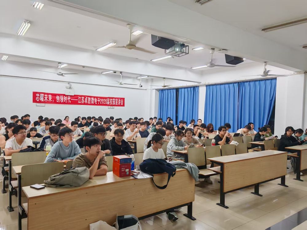 10月17日晚18:30,为促进集成电路产业人才培养与输送,搭建优秀学子与行业龙头企业的对接桥梁,学院与江苏卓胜微电子股份有限公司联合举办的“芯曜未来,创领时代”2026届校园招聘宣讲会于我校隆重举行。此次活动吸引了来自集成电路、微电子、电子信息、计算机等相关专业的百名本、硕、博毕业生踊跃参与,现场气氛热烈,座无虚席。