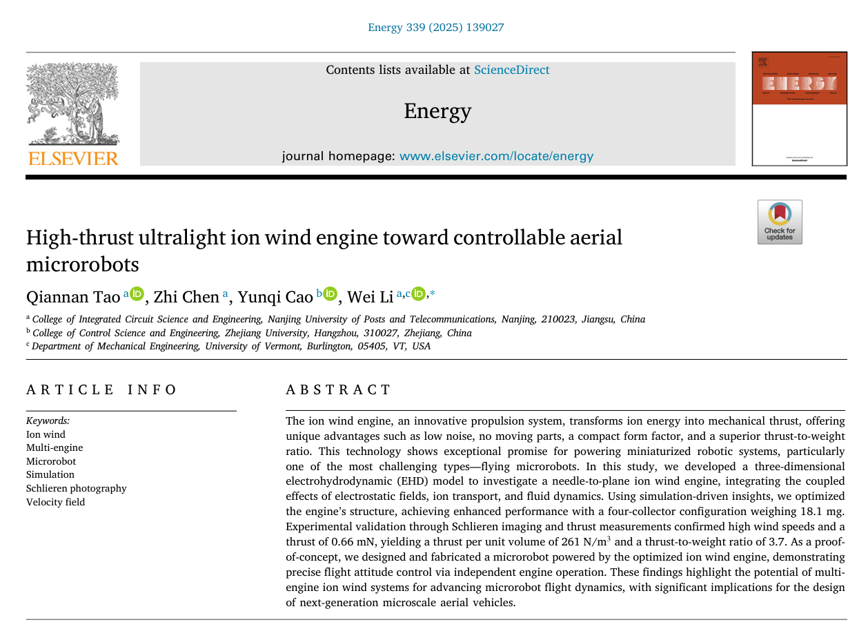近日,我院智能微机电系统团队在微型飞行机器人领域取得重要突破,其研究成果《High-thrust ultralight ion wind engine toward controllable aerial microrobots》正式发表于能源领域国际权威期刊《Energy》(中科院一区TOP期刊,2025年影响因子:9.4)。该论文第一作者为我院青年教师陶倩楠,研究生陈挚为联合作者,通讯作者为李巍教授。