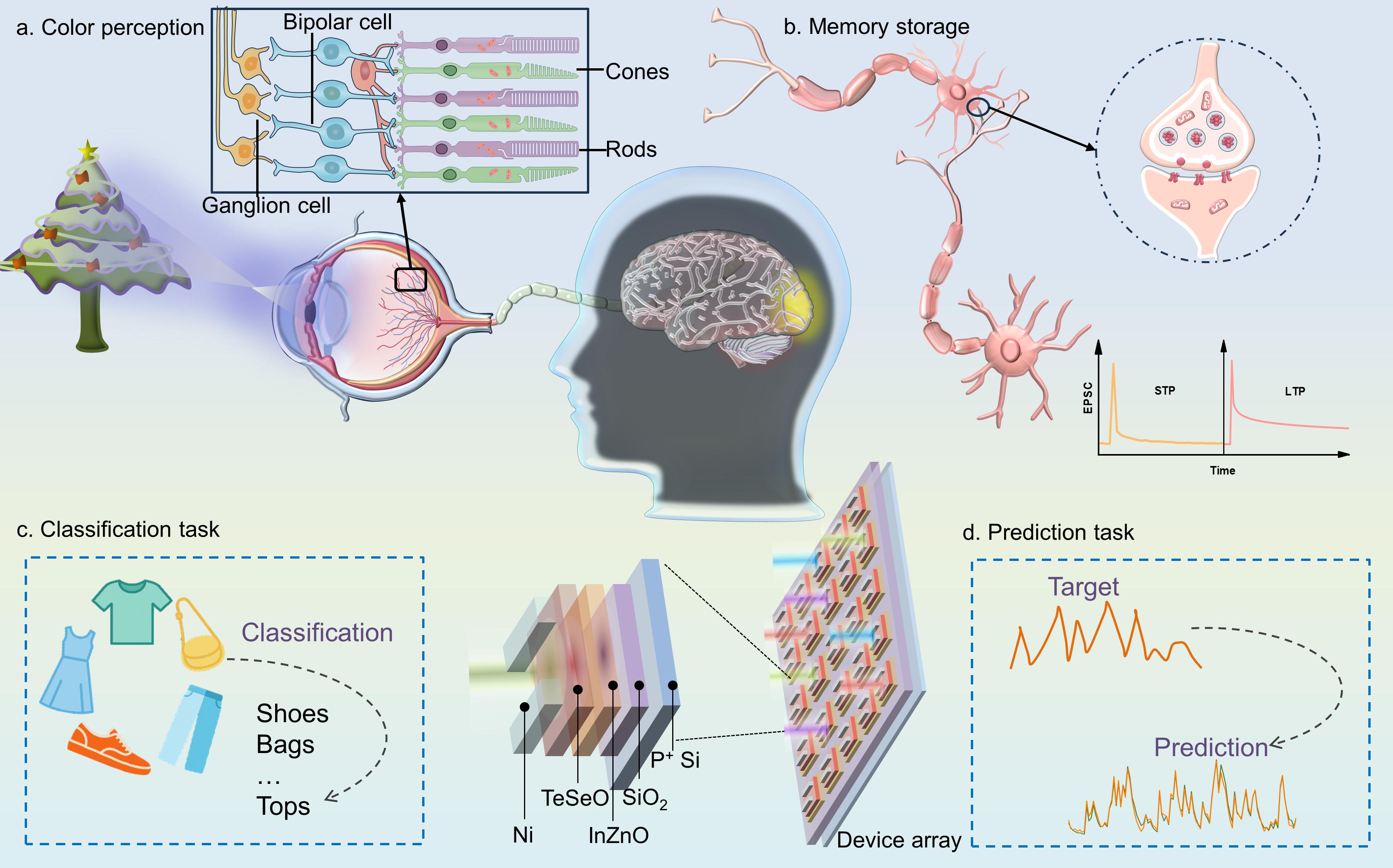 图1 人类视觉感知系统示意图与多光谱感知TeSeO/InZnO光电突触储备池计算。